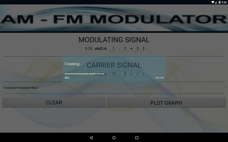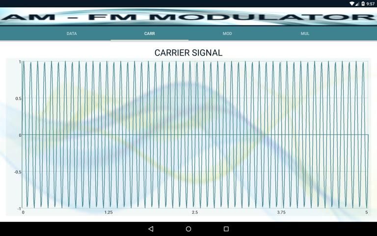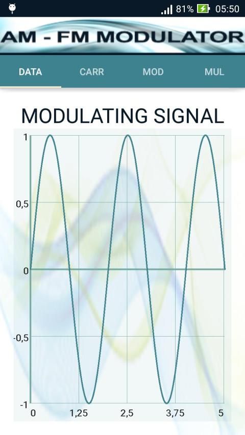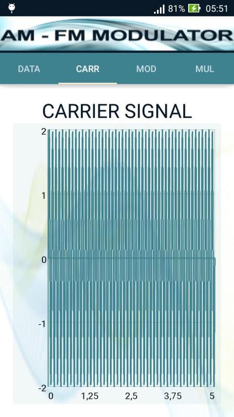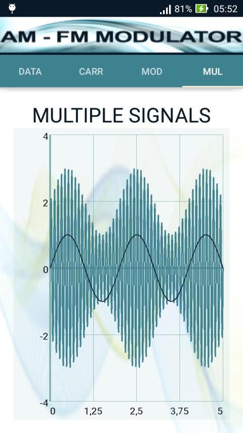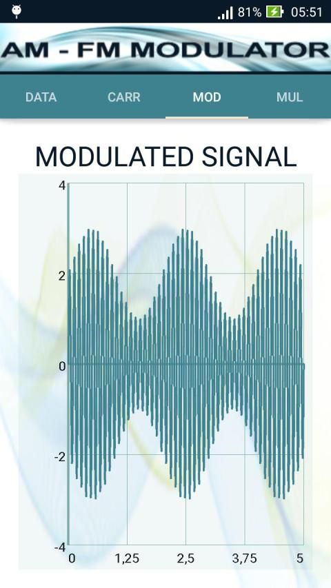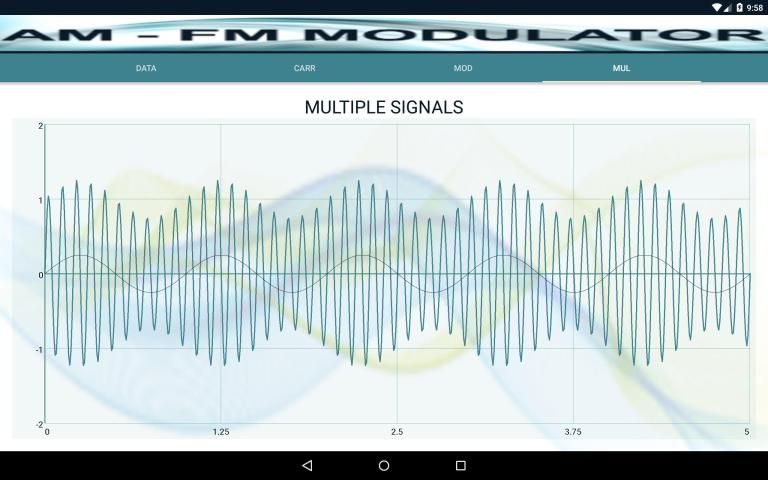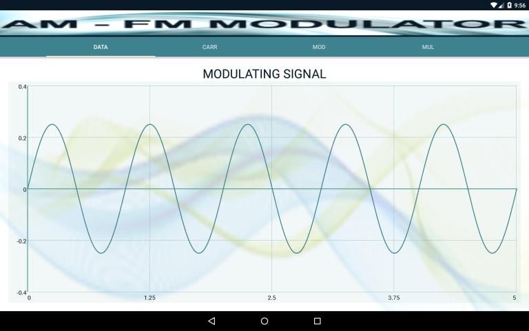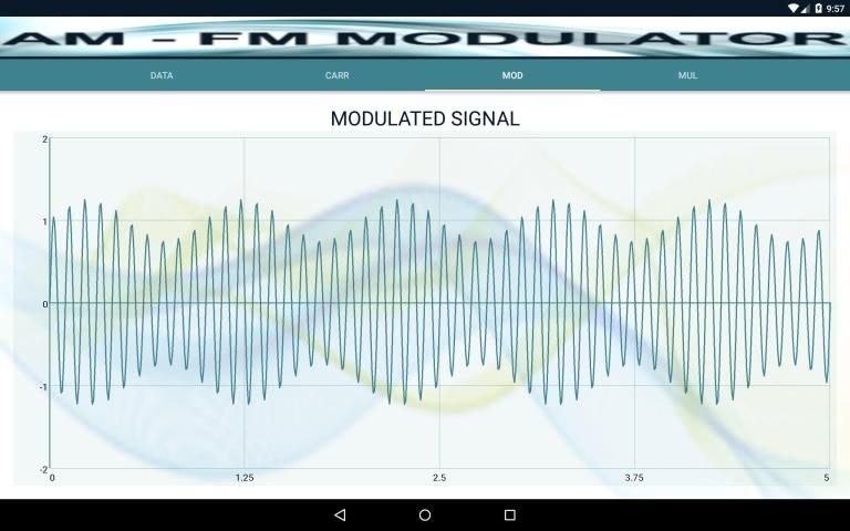 Aplikasi membuat sampel poin di dua ruang dimensi dan plot grafik. Sampel tergantung interval waktu yang Anda tetapkan. Setiap satuan waktu memiliki seratus titik sampel untuk grafik. Setelah data yang disusun pengguna dapat melihat empat grafik yang berbeda: modulasi gelombang Grafik, Carrier Gelombang Grafik, Modulated Gelombang Grafik dan Multi Gelombang Grafik yang menunjukkan modulasi dan Modulated Waves.