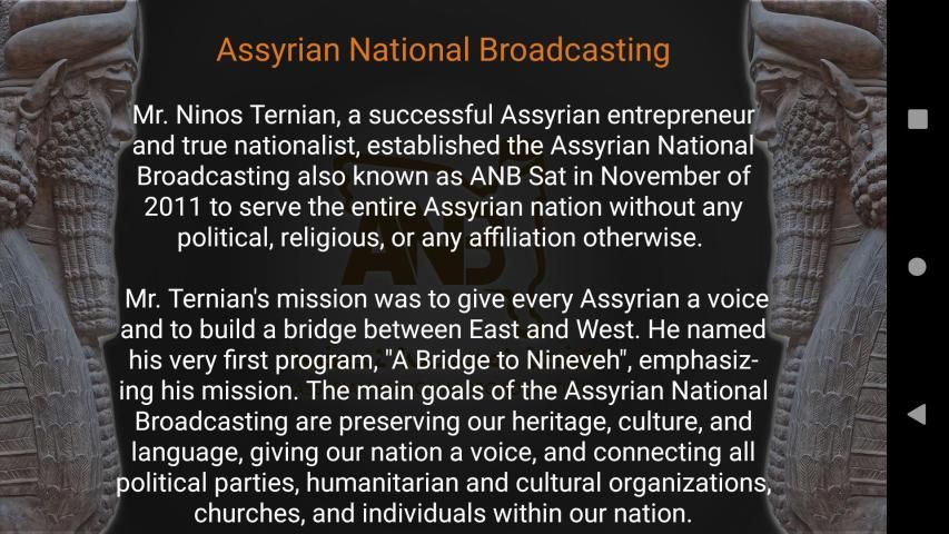 Bpk. Ninos Ternian, seorang wiraswasta Asyur yang sukses dan nasionalis sejati, mendirikan Siaran Nasional Asyur yang juga dikenal sebagai ANB Sat pada bulan November 2011 untuk melayani seluruh bangsa Asyur tanpa politik, agama, atau afiliasi apa pun. Pelajari lebih lanjut di https://www.anbsat.com