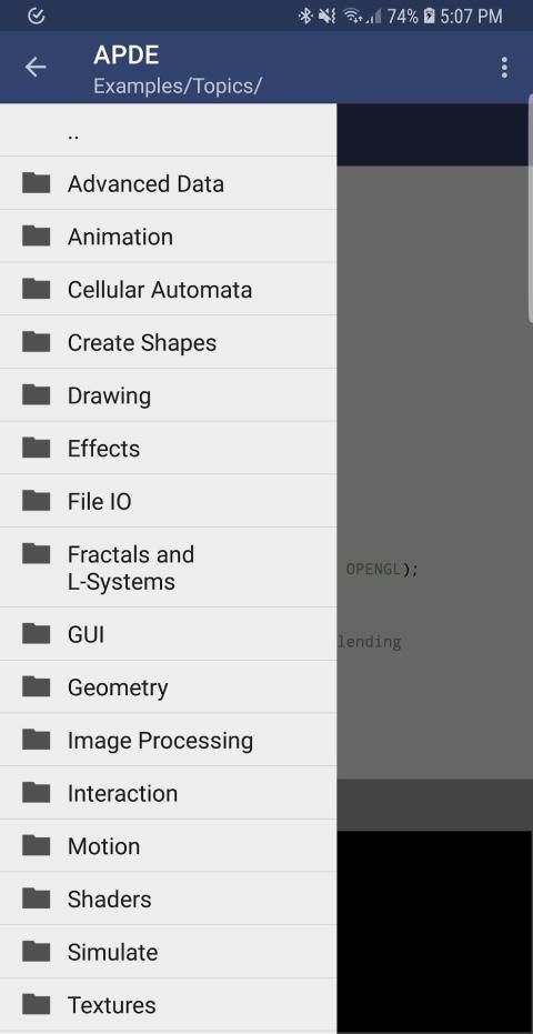 APDE (Android Pengolahan Development Environment) adalah sebuah lingkungan pengembangan terintegrasi untuk menciptakan sketsa Pengolahan di ponsel / tablet. APDE mendukung mengedit penuh, kompilasi, dan siklus run. Anda tidak perlu komputer atau SDK untuk memulai coding di perjalanan.
