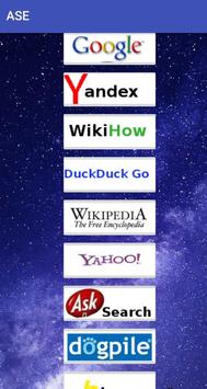 ASE is the Search engine app, which contain Top search engines such as Google, Yandex, Duckduckgo, Wikipedia, Wikihow, Ask, Yahoo, dogpile, and Bing etc, in one ASE app. The application allow the users to use only one ASE app, instead of using separate application for searching.
