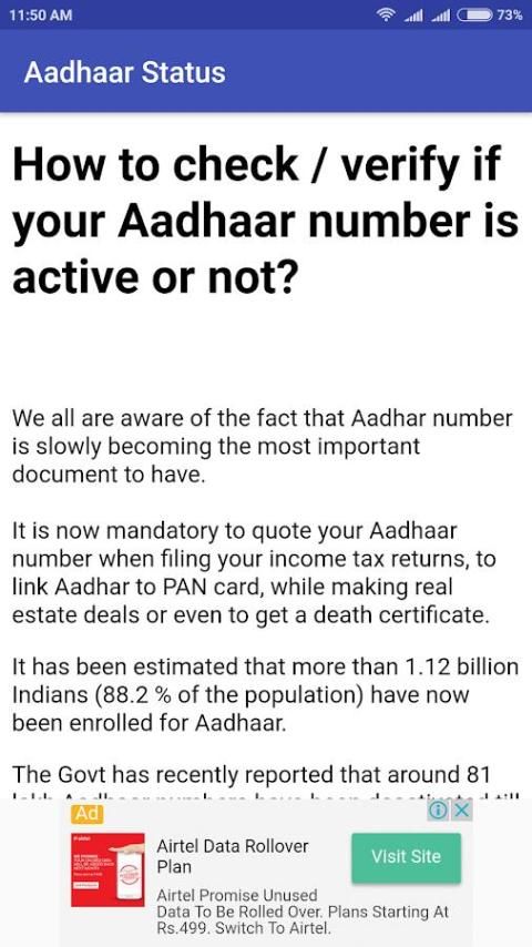 Status Aadhaar adalah aplikasi mobile yang didesain untuk mendapatkan status Aadhaar dengan memberikan nomor pendaftaran 14 digit. Aplikasi bekerja dalam modus offline dan tingkat SMS standar berlaku untuk mengakses layanan.