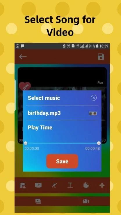 Dengan editor video, ubah lagu menjadi video atau ubah musik latar menjadi video. pemotong video audio musik akan memungkinkan editor video musik editor suara video atau dapat mengubah audio ke video. setelah itu Anda dapat menyimpan video yang diedit dan membaginya dengan teman-teman Anda.