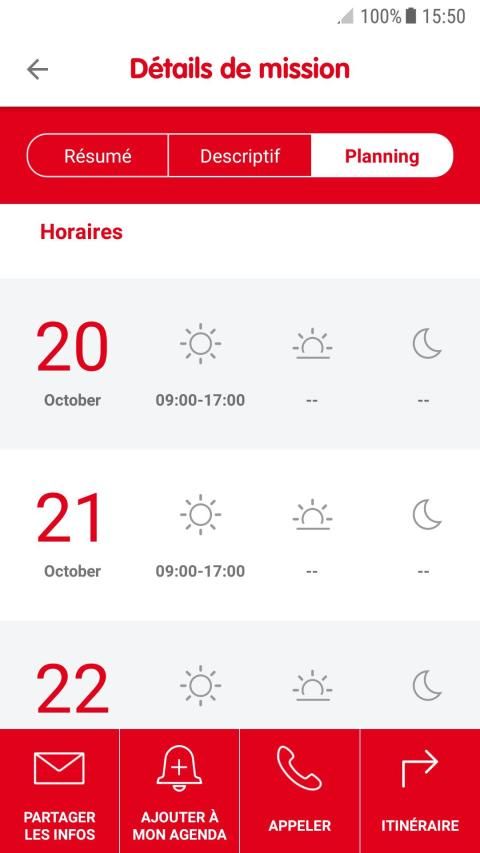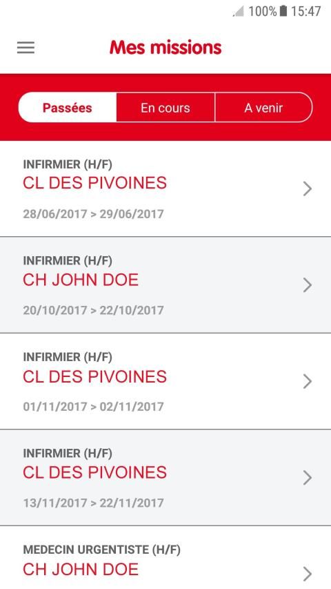 - d’accéder au détail de vos missions en cours ou à venir (planning, adresse, nom du service…)
