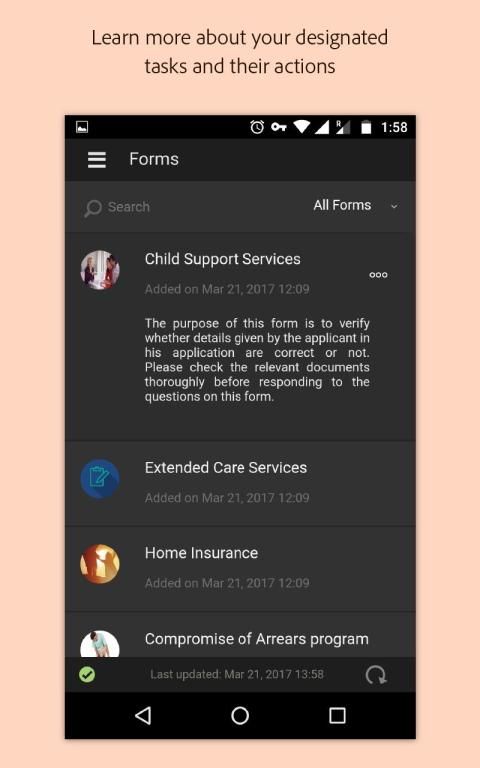 This free app is designed for use with Adobe Experience Manager (AEM) Forms. It allows your field workforce to take forms, documents and associated workflows beyond desktops onto mobile devices. Capture or verify data offline and synchronize with the server when online. Eliminate clunky paper forms, rekeying data back at the office, and rework due to incomplete or missing information. Prefill data through backend system integration for faster processing in the field and once the task is completed, send data back to other systems. The application works with Adobe Experience Manager Forms Server versions 6.3, 6.4 and 6.5.