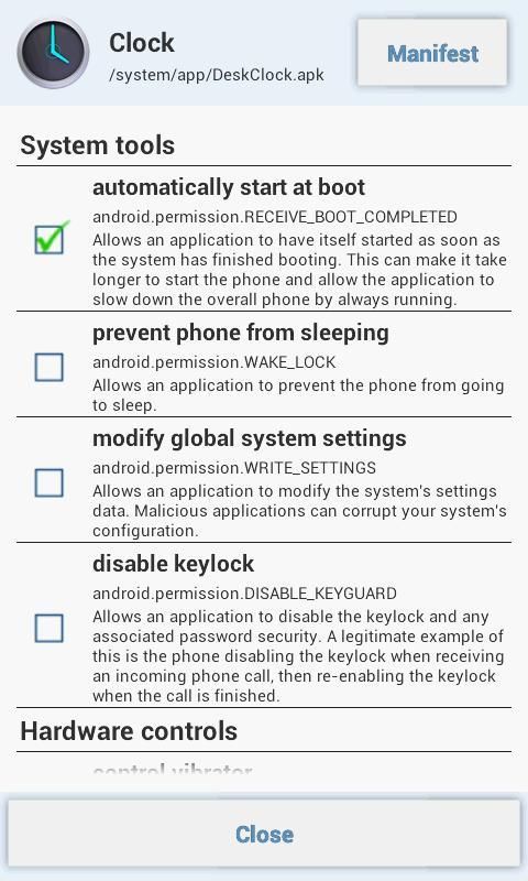 Alat ini mampu menelusuri izin aplikasi diinstal dan menghasilkan berbagai perizinan laporan (seperti yang aplikasi memiliki izin secara otomatis startup, mengirim SMS, dll). Yang paling penting, memungkinkan kita untuk menghapus hak akses dari aplikasi dan file apk TANPA akses ROOT.