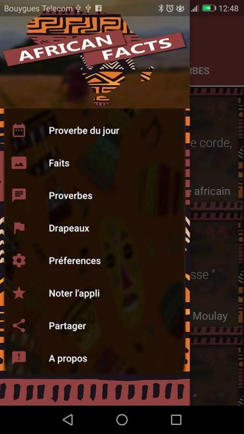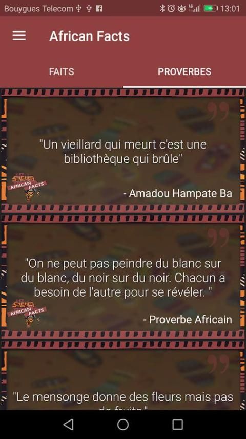Fakta Afrika (Fakta dan peribahasa Afrika) adalah sebuah aplikasi yang memungkinkan Anda untuk mengembangkan budaya Afrika umum Anda.