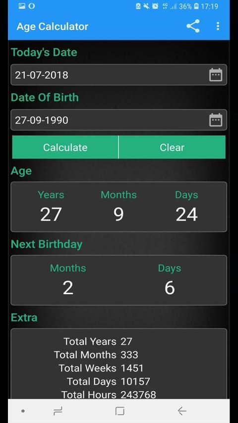 Here is the age calculator app which helps you in calculating your lifetime on earth until now and also calculates how many days are left for your next birthday.