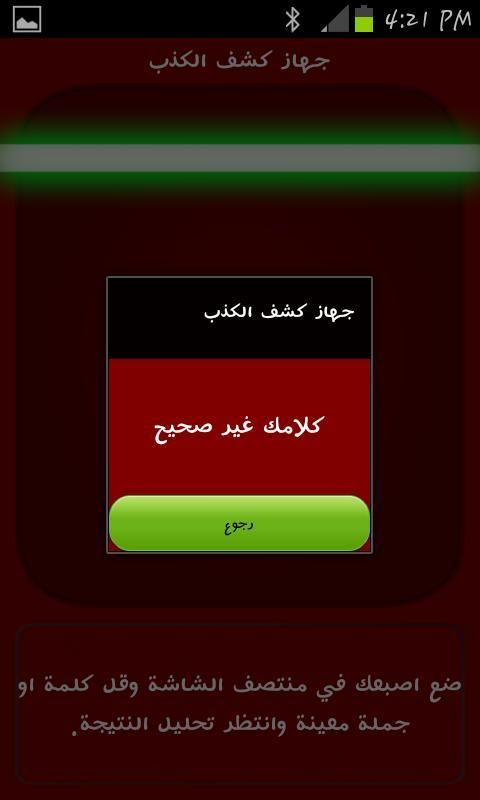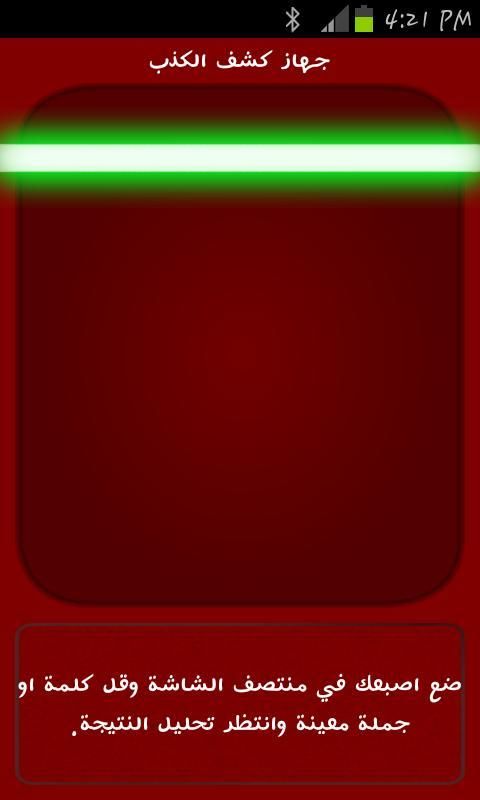 فاجئ الشخص الاخر ان لديك برنامج يكشف الكذب فكرة البرنامج بسيطة جدا كل ما عليك فعله هو الضغط على الزر الاخضر وقل سؤلا او جملة واستمر بالضغط لحين اكمال سؤالك وسوف يعرف البرنامج هل انت صادق ام كاذب.