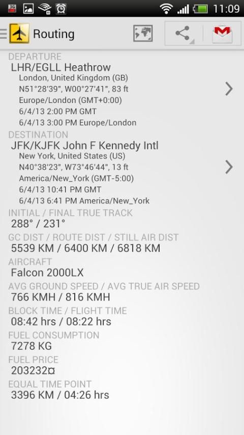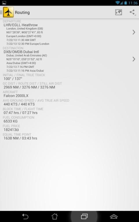 Based on user inputs of the departure and destination airports, and a required arrival time, or a required departure time - the app calculates the flight distance and time and the required departure time from the departure airport, or the planned arrival time at the destination airport. All times are given in both GMT and Local Time. The distance between the departure and destination airports can be compensated for departure and arrival routings (SID and STAR compensation) and ATC routing (great circle distance compensation in percent). The flight time can be compensated for aircraft average cruise speed (user entry), winds (head or tailwind compensation) and airport taxi times (user entry).