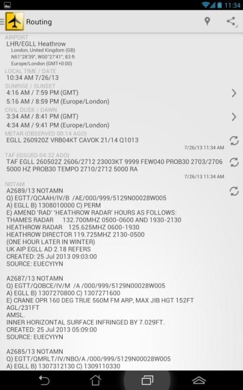 The calculation will also give information on airport positions, GMT offset, sunrise and sunset as well as the latest METAR, TAF and NOTAMS that are fetched behind the scenes when the airports are entered. A special feature is the ETP calculation, that will calculate the ETP point referenced to the departure airport. The ETP point is useful when searching for a fuelstop or just wants to know the midpoint on the route when taking account of the wind. The whole routing and ETP point, as well as en-route alternate airports, are shown on a map for a good overview.