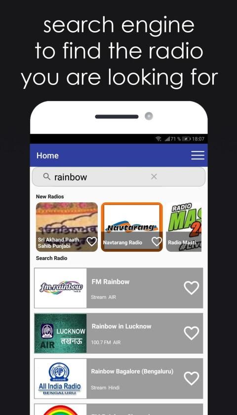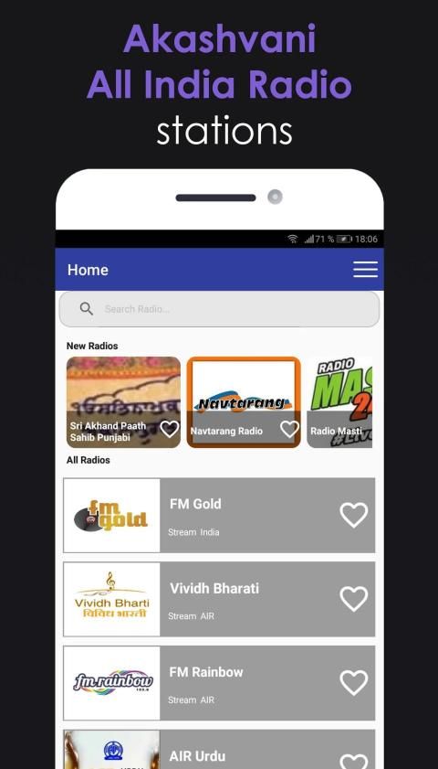 AIR Assamese, AIR Bangla, AIR Gujarati, AIR Kannada, Air Lucknow, AIR Malayalam, Air Manjeri FM, AIR Marathi, AIR Odia, AIR Punjabi, AIR Siliguri, AIR Tamil, AIR Telugu, AIR Urdu, BBC Arabic, BBC Bangla, BBC Hindi radio, Bhajan Radio, BhajanStream, Big FM 92.7 , Dhamaal FM, FM Gold, FM Rainbow, Geetham Radio - 80s Tamil Songs, Geetham Radio - Old Songs, Geetham Tamil Radio, Hello, Hindi Christian Music Songs Radio, Kalasam FM Tamil, LycaDilse Radio 1035, Mohd Rafi Radio, Mohd Rafi Radio, North Eastern Service, Odia Radio India Bhubaneshwar, Psalms Radio, Puradsi Isaiyaruvi FM Tamil, Raagam, Radio Central Hindi Online Streaming FM Radio, Radio City - Hindi, Radio City Classics, Radio City Dance, Radio City Freedom, Radio City Fun Ka Antenna, Radio City Fusion, Radio City Indipop, Radio City International, Radio City Kannada, Radio City Love, Radio City Malayalam, Radio City Rock, Radio City Smaran, Radio City Tamil, Radio HSL, Radio Kashmir, Radio Madhuban, Radio Manna - Malayalam, Radio Manna - Tamil, Radio Mirchi, Radio olive, Radio Punjabi Mehak, Radio Schizoid, Radio Sharda, Radio Srinagar, Radio Suno, Radio Udaan, Radio Umang, Rainbow bangalore, Rainbow Chennai, Rainbow Delhi, SGPC - Live Kirtan Sri Harmandir Sahib, Vividh Bharati, Telugu Radio, and much more of Indian radio right in your hands.