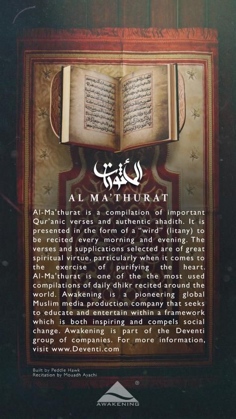 Al-Ma'thurat adalah kompilasi dari ayat-ayat penting Qur'an dan hadits otentik. Ini disajikan dalam bentuk “wird” (litani) untuk dibaca setiap pagi dan sore hari. Ayat-ayat dan permohonan yang dipilih memiliki sifat spiritual yang luar biasa, terutama dalam hal memurnikan hati. Al-Ma'thurat adalah salah satu kompilasi dzikir harian yang paling banyak digunakan di seluruh dunia. Awakening adalah perusahaan produksi media Muslim global perintis yang berupaya mendidik dan menghibur dalam kerangka kerja yang menginspirasi sekaligus mendorong perubahan sosial. Kebangkitan adalah bagian dari kelompok perusahaan Deventi. Untuk informasi lebih lanjut, kunjungi www. Deventi.com
