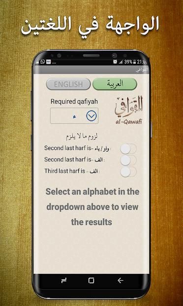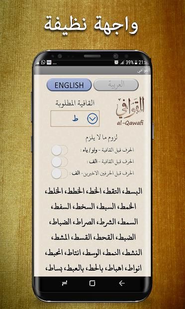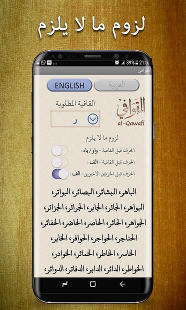 الأولى من نوعها في تاريخ التطبيقات بأكملها. أصبح من السهل الآن الحصول على نقرات لجلب كلمات القافية للشعر العربي. فقط أدخل الأبجدية الأخيرة من الكلمة التي تريد ان تنشأ النظم عليها - وسوف ترى قريبا من مئات القوافي على نفس تلك القافية المذكورة