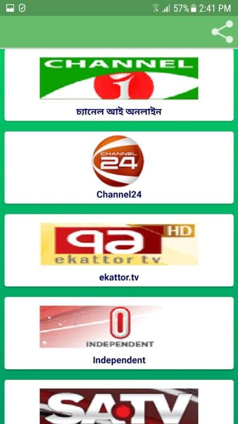 Bangladesh Televisi (BTV), Channel i, Somoy tv, Channel 24, RTV, NTV, Gazi tv (GTV), News24, ATN Berita, Ekattor tv, tv Independen, SA tv, Jamuna tv, Bangla Vision, ETV Ekushe, ATN Bangla , Deepto tv, channel 9, tv saya, Boishaki tv, Maasranga tv, Mohona tv, Desh tv.