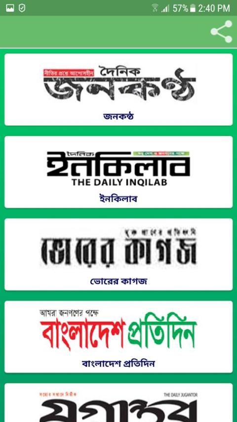 Prothom Alo (Salah satu surat kabar yang paling banyak dibaca di Bangladesh), Ittefaq (Salah satu surat kabar harian yang paling banyak beredar di Bangladesh), Kaler Kantho (markas koran broadsheet harian di kota Bashundhara, Dhaka), Jugantor (Leading koran broadsheet Bangladesh diterbitkan dalam Dhaka), Bangladesh Protidin (Menampilkan berita terbaru dan informasi tentang politik, bisnis, pertanian, dan lebih), koran Format ManabZamin (Tabloid diterbitkan di Dhaka, Bangladesh.), Shamokal (koran harian Bangladesh diterbitkan di Dhaka), Amader Shomoy, Janakantha, Inqilab, Bhorer Kagoj (Menyediakan analisis mendalam pada berita internasional serta perspektif lokal dan regional), Sangbad, Dinkal, Noya Diganta, Jai Jai Din, Sangram, Manobkantha, Alokito Bangladesh.