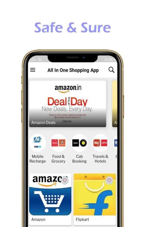 Aplikasi belanja All-in-One menyediakan akses mudah ke semua toko online: Amazon, Flipkart, Snapdeal, ShopClues, Ebey, dan banyak lagi.