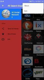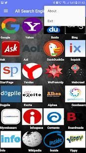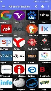 Di sini Anda dapat menggunakan mesin pencari Web utama seperti Google Yahoo Baidu Bing Tanyakan Aol DuckDuckGo Startpage startpage Yandex WolframAlpha WebCrawler Dogpile Excite Alphee Goodsearch MyWebSearch InfoSpace Contento Boardread yang Info Wikipedia dalam yippy dan lebih .. dengan aplikasi sederhana Anda dapat mencari lebih dari 24 Mostar menggunakan pencarian mesin menggunakan Aplikasi Tunggal.