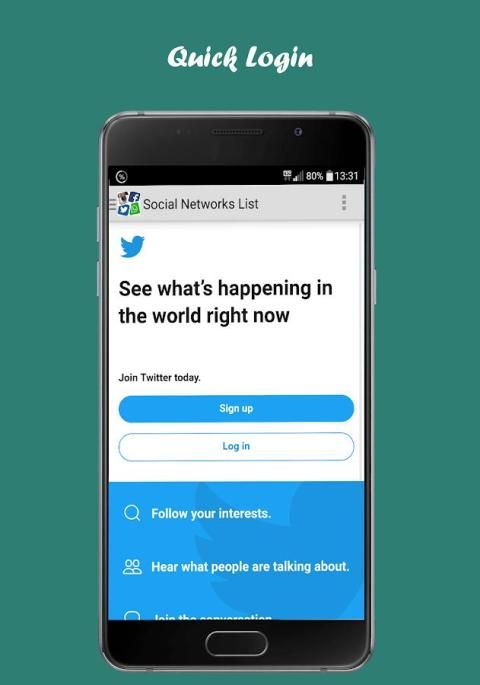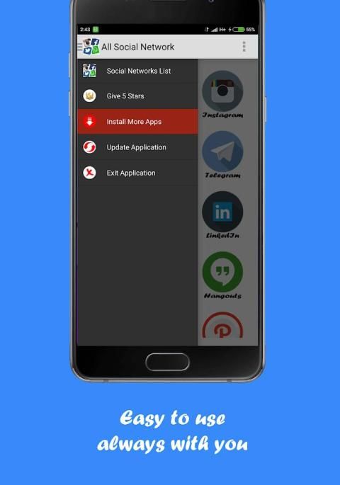 Semua Social Network adalah sebuah aplikasi yang kelompok dan memberikan akses mudah ke semua jejaring sosial yaitu: Facebook, Twitter, Instagram, Snapchat, WhatsApp, Messenger, Telegram, Pinterest, Snapchat, Linkedl, Youtube, Hangouts, Skype, mamba, Path, Netflix , Flipagram, Flipboard, SayHi, Badoo, Hitwe, Lovoo, Hi, VK, Tagged, Viber, Line, Tango, MeetMe, Meetup, WeChat, Bip, OkCupid, ZapChat, Flickr, Tinder Foursquare, Twoo, WeHeartit, Azar, Quora, Topface, DeviantArt, Flirch, Moco, Waplog, indah, Zoosk, Jauma, Askfm, Hoott, Yahoo, Gmail, Outook, Periscope, Tumblr, HipChat, wayn, Xing, Cyworld ... dan banyak lagi