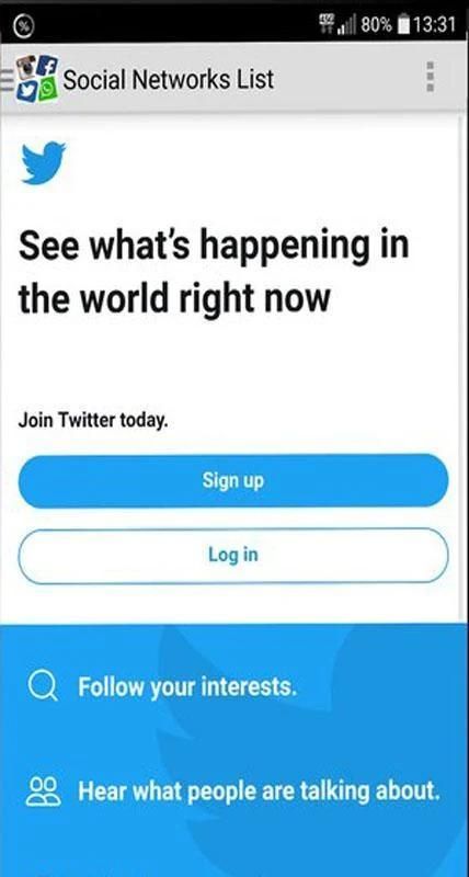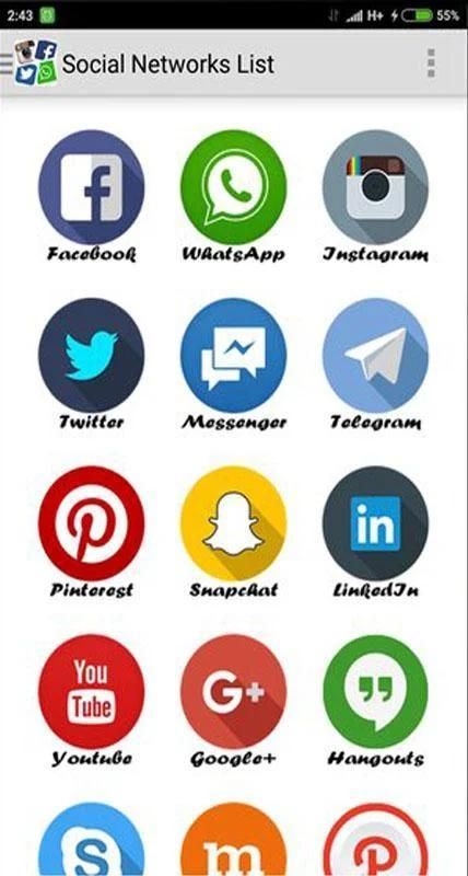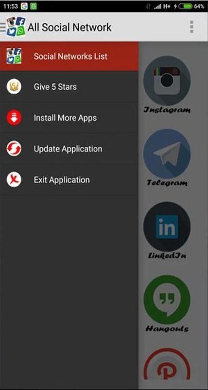 Semua Social Network adalah sebuah aplikasi yang kelompok dan memberikan akses mudah ke semua jejaring sosial yaitu: Facebook, Twitter, Instagram, Snapchat, WhatsApp, Messenger, Telegram, Pinterest, Snapchat, Linkedl, Youtube, Hangouts, Skype, mamba, Path, Netflix , Flipagram, Flipboard, SayHi, Badoo, Hitwe, Lovoo, Hi, VK, Tagged, Viber, Line, Tango, MeetMe, Meetup, WeChat, Bip, OkCupid, ZapChat, Flickr, Tinder Foursquare, Twoo, WeHeartit, Azar, Quora, Topface, DeviantArt, Flirch, Moco, Waplog, indah, Zoosk, Jauma, Askfm, Hoott, Yahoo, Gmail, Outook, Periscope, Tumblr, HipChat, wayn, Xing, Cyworld ... dan banyak lagi