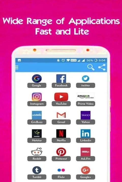 This app works in all Network Conditions, Compressed to Low sized App(3.8 MB) Social Networks All in one.