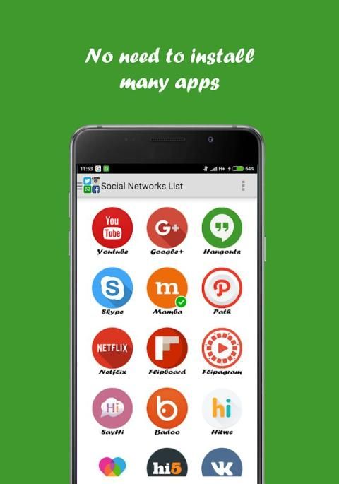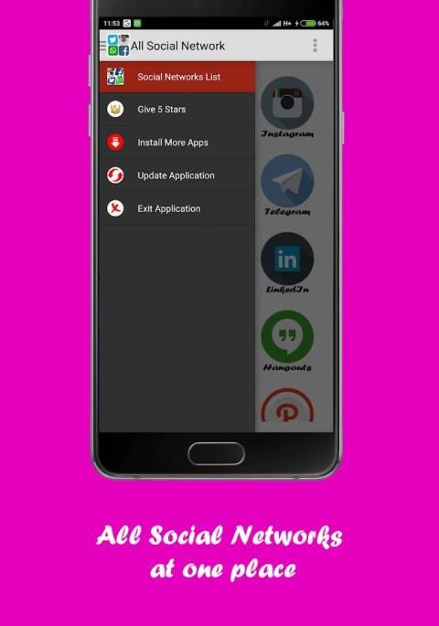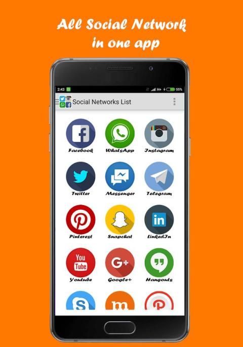 Semua Social Network adalah sebuah aplikasi yang kelompok dan memberikan akses mudah ke semua jejaring sosial yaitu: Facebook, Twitter, Instagram, Snapchat, WhatsApp, Messenger, Telegram, Pinterest, Snapchat, Linkedl, Youtube, Hangouts, Skype, mamba, Path, Netflix , Flipagram, Flipboard, SayHi, Badoo, Hitwe, Lovoo, Hi, VK, Tagged, Viber, Line, Tango, MeetMe, Meetup, WeChat, Bip, OkCupid, ZapChat, Flickr, Tinder Foursquare, Twoo, WeHeartit, Azar, Quora, Topface, DeviantArt, Flirch, Moco, Waplog, indah, Zoosk, Jauma, Askfm, Hoott, Yahoo, Gmail, Outook, Periscope, Tumblr, HipChat, wayn, Xing, Cyworld ... dan banyak lagi