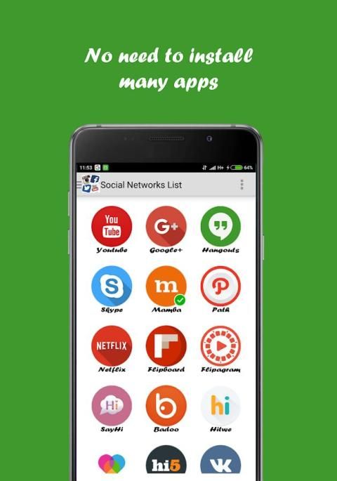 Semua Social Network adalah sebuah aplikasi yang kelompok dan memberikan akses mudah ke semua jejaring sosial yaitu: Facebook, Twitter, Instagram, Snapchat, WhatsApp, Messenger, Telegram, Pinterest, Snapchat, Linkedl, Youtube, Hangouts, Skype, mamba, Path, Netflix , Flipagram, Flipboard, SayHi, Badoo, Hitwe, Lovoo, Hi, VK, Tagged, Viber, Line, Tango, MeetMe, Meetup, WeChat, Bip, OkCupid, ZapChat, Flickr, Tinder Foursquare, Twoo, WeHeartit, Azar, Quora, Topface, DeviantArt, Flirch, Moco, Waplog, indah, Zoosk, Jauma, Askfm, Hoott, Yahoo, Gmail, Outook, Periscope, Tumblr, HipChat, wayn, Xing, Cyworld ... dan banyak lagi