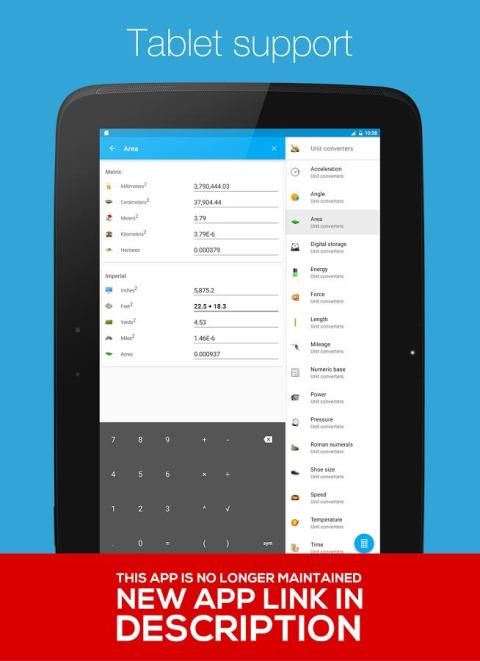 Ini adalah kalkulator yang besar untuk sekolah dan pekerjaan rumah, tapi tidak hanya. Jika Anda seorang sarjana, mahasiswa, guru. pembangun, tukang, kontraktor, dll .. dan Anda perlu semua dalam satu alat untuk perangkat Anda, memberikan ini mencoba. Anda tidak akan kecewa.