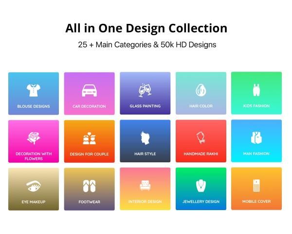 All in One Design Collection App provides many categories which are sub divide into sub categories.