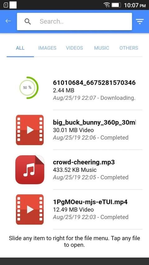 Setelah unduhan Anda selesai, pemberitahuan akan ditampilkan kepada Anda. Dan dengan masuk ke Halaman Unduhan Saya, Anda dapat membuka file dengan mengetuknya, atau berbagi dan menghapusnya dengan menggeser item ke kanan. Jika konten yang diunduh adalah Foto atau Video, itu juga akan disimpan ke Galeri Anda ke dalam album 'AllDownloadr'.