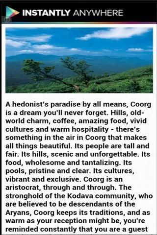 Aplikasi ini membantu wisatawan untuk memilih hotel terbaik dari jarak anggaran mereka. Ini daftar keluar nomor telepon hotel dan agen perjalanan dari semua tempat wisata. Aplikasi ini memuat peta wilayah dengan tampilan satelit. Pengguna aplikasi dapat memilih kabupaten atau memilih tempat dari daftar "Sering dikunjungi", untuk mendapatkan rincian lengkap tentang tempat wisata di negara bagian Karnataka.