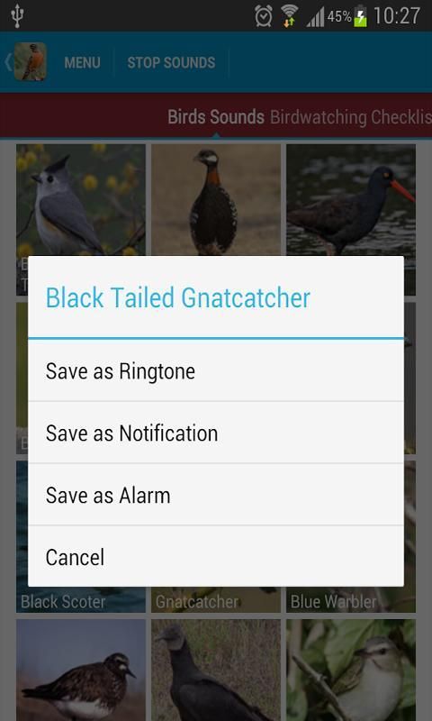 Semua suara dapat disimpan sebagai Ringtones, Pemberitahuan dan Alarm dengan panjang menekan burung dan memilih opsi yang relevan.
