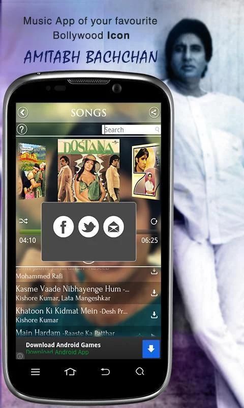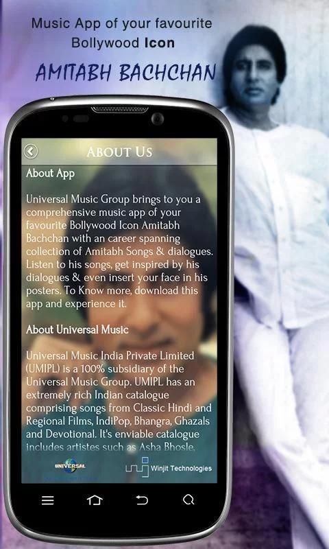 Universal Music Group membawa kepada Anda sebuah aplikasi musik komprehensif favorit Bollywood Icon "Amitabh Bachchan" dengan mencakup koleksi karir Amitabh Songs & dialog. Dengarkan lagu-lagunya, terinspirasi oleh dialog-dialognya & bahkan memasukkan wajah Anda dalam posternya. Tahu lebih lanjut, download aplikasi ini dan mengalaminya.