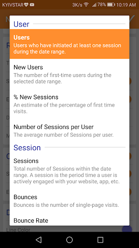 It has a lot of categories and metrics from Google Analytics which you can track. For example: Users, Sessions, Adsense, Adwords, Ecommerce, Ad Exchange, Site Speed, App Tracking, Traffic Sources, Global Conversions, Page Tracking, Internal Search, User Clicks, Event Tracking, Social Interactions, User Timings and etc. Track statistics from a lot of web sites at the moment.