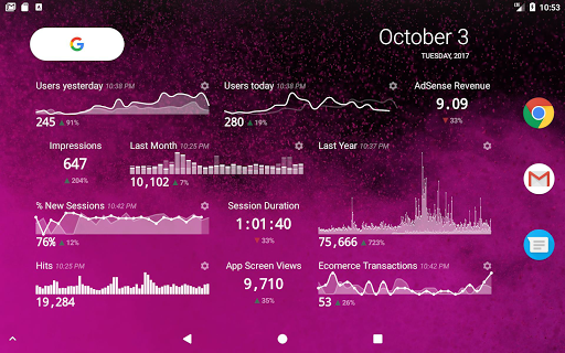 Analytics Widget is a Google Analytics Informer which provides charts with metrics, trends and statistics in timeline view from Google Analytics service.