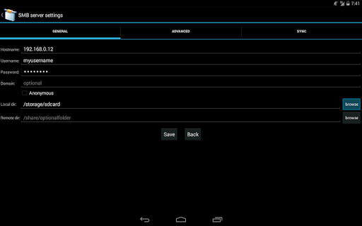 AndSMB is a SMB (Samba/CIFS) client for Android devices. It allows connecting to shared folders hosted on Windows or Samba servers over Wifi/3G/4G. It allows managing several connections with authentication. It comes with both a device file browser and a SMB file browser. It provides download and upload support for files and folders. It can synchronize folders. You can rename, delete, get file details, create folders open local and remote files. It comes with share feature for gallery. WINS server, LMHOSTS and broadcast address options are available for name resolution. Browse and transfer intents are available for third party applications. Root access is not needed.