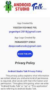 In this section If u have any queries regarding programming within an app, you can directly ask by clicking on mail Id given in the activity itself which will directly open your Gmail account and you can read our privacy policy regarding Android Studio Talk which will explain about this app.