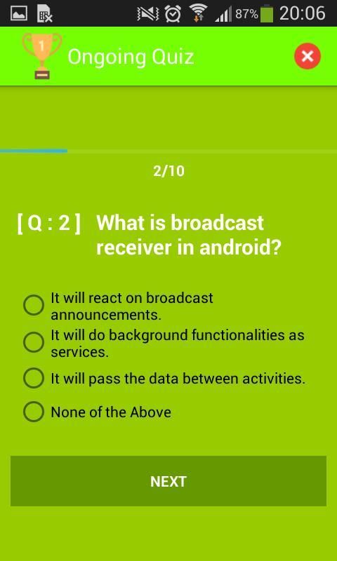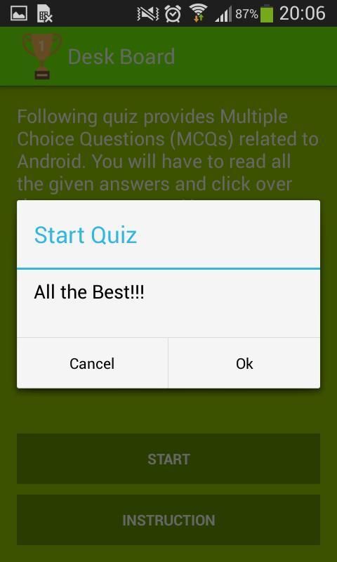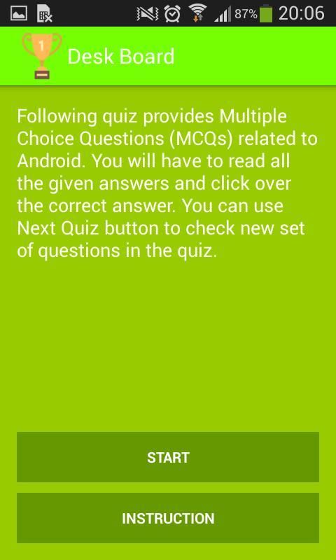 Aplikasi ini memberikan instruksi tentang aturan kuis wawancara Android.