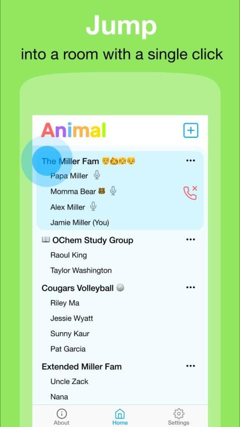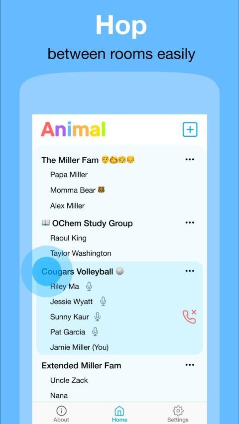 Create separate rooms for your friends and family and easily hop between them! See who’s already online, hop into their room, and join the conversation. Animal is perfect for keeping in touch with the people who matter most. Group calls have never been easier!