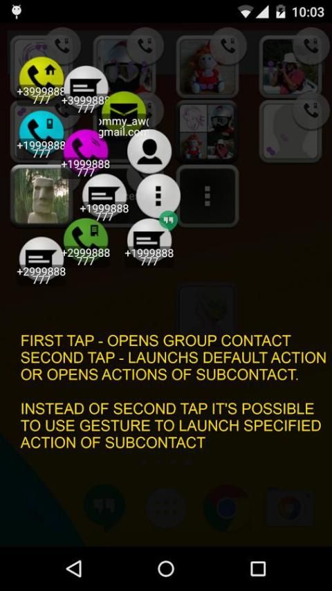 Widget kontak menunjukkan foto dari kontak dan menyediakan akses cepat ke tindakan berbagai kontak: panggilan telepon, SMS, chatting, email, mengirimkan pesan melalui instant messenger yang berbeda, membuka alamat pos di peta, membuka URL di browser dan sebagainya. Widget kontak memungkinkan aplikasi pra-pilih Anda untuk tindakan tertentu (panggilan, pengiriman pesan atau email, dll). Mulai tindakan dalam 1-2 tap. Peluncuran Satu-tap dan peluncuran double tap didukung.