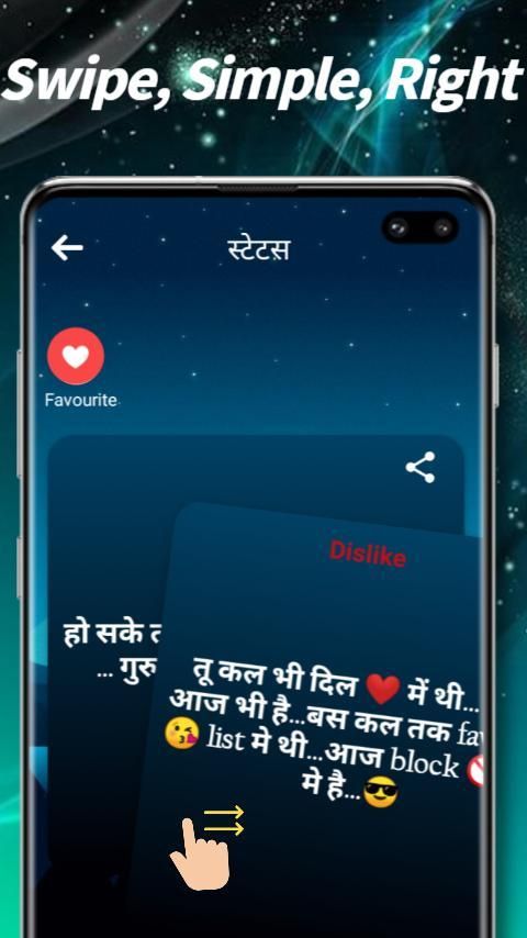 This app contains Hindi Language Status for all Social Media Apps. Keep updating your whts app status on famous social apps with the help of this app.