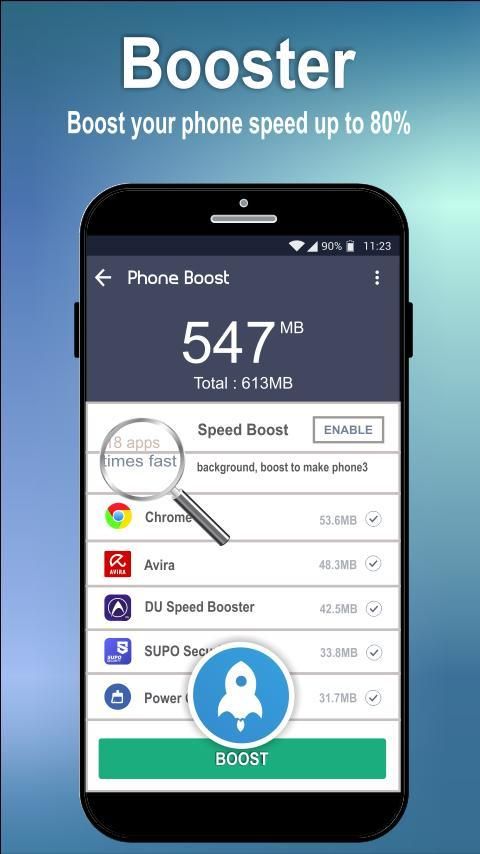 Gunakan pacuan 1-ketukan pada layar awal untuk mempercepat ponsel Anda dengan cepat hingga 50%! Bebaskan memori dan tutup aplikasi yang berjalan di latar belakang hanya dalam beberapa detik!