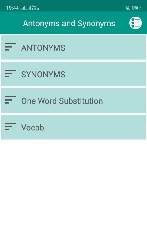Antonyms-Sinonim App adalah aplikasi Tata Bahasa Inggris oleh GKtalk. Dalam aplikasi ini berbagai kuis dengan antonim dan Sinonim penting sedang disediakan. Aplikasi ini dapat sangat berguna untuk kompetisi PO Bank, SSC, IPBS, dan Komisi Layanan Publik. Kami telah memilih kata-kata ini dari buku tata bahasa Inggris yang terkenal dan makalah Pemeriksaan terakhir.