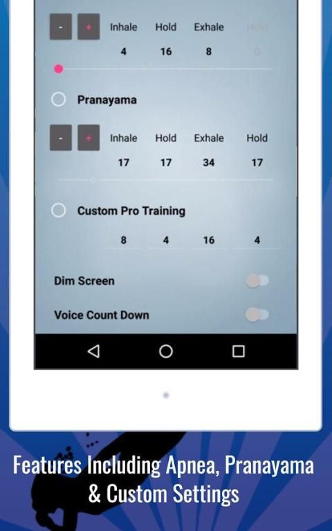 Program ini juga akan berguna sebelum menyelam sebenarnya sejak mode pranayama sudah termasuk. The Apnea Trainer akan membantu Anda menjaga seluruh tubuh Anda tenang dan memberikan persiapan yang sempurna bagi mereka yang menakjubkan, menyelam tahan lama.