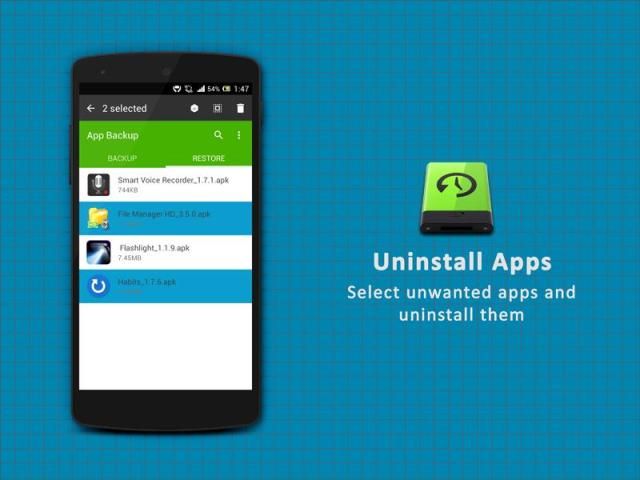 App Backup & Restore menunjukkan Anda bagaimana untuk menghapus aplikasi dari ponsel Anda. App Backup & Restore selain itu menghemat aplikasi Anda dengan membuat copie dari mereka juga akan mengajarkan Anda bagaimana untuk menghapus aplikasi yang Anda tidak perlu lagi dan membebaskan ruang penyimpanan.
