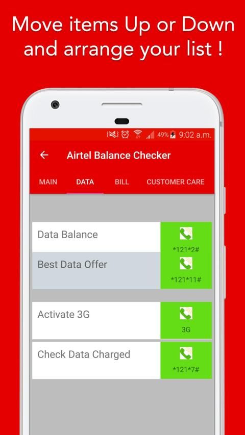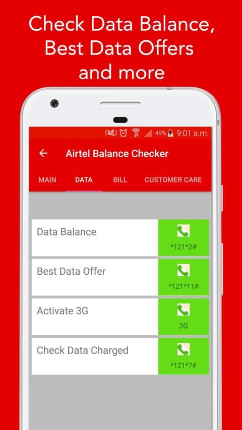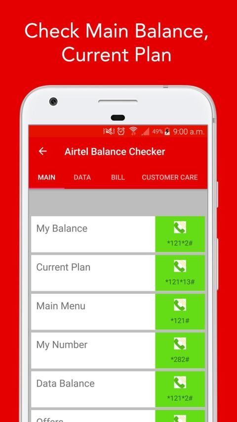 Airtel Balance Check (India): Main Balance check, Data balance check, Due Amount check, To transfer balance at your finger tips, Payment details, Payment Bank Details, Last recharge history at your finger tips.