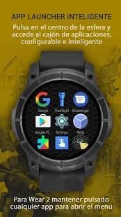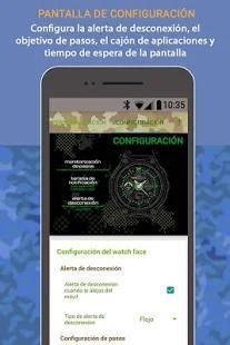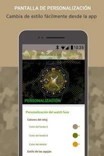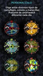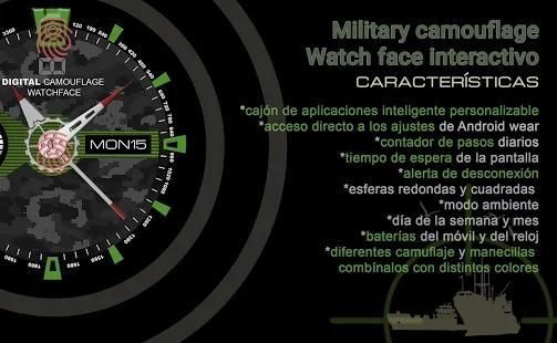 Wear watchface interactivo y de esfera analógica, app launcher inteligente y configurable, accede más fácilmente a las apps de tu wear, acceso directo a los ajustes del smartwatch, contador de pasos y kilometros y calorias, batería del Wear y del teléfono, te avisa si te alejas de tu móvil, elige entre diferentes diseños de camuflaje militar y viste diferente cada día tú reloj Android Wear