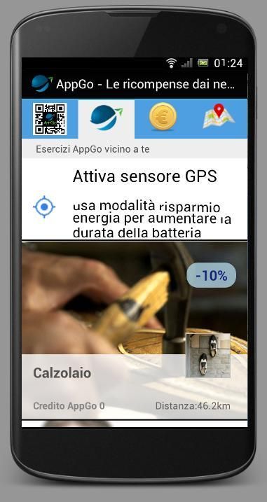 AppGo è una applicazione ti consente di maturare Crediti da spendere incondizionatamente nei migliori esercizi e attività commerciali sul territorio. Iscrivendosi ad AppGo si inizia da subito a collezionare Crediti. Scopri quali imprese sono affiliate al programma di fidelizzazione AppGo su www.appgo.it e su applicazione AppGo e scopri quali prodotti siano in offerta.