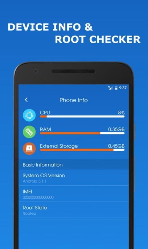 Lihat informasi perangkat Anda seperti RAM, CPU, OS Version, IMEI, akar Checker.