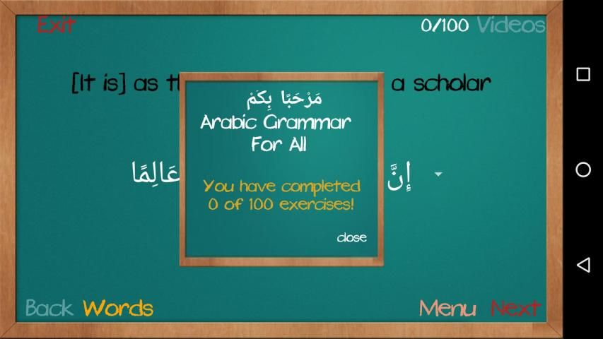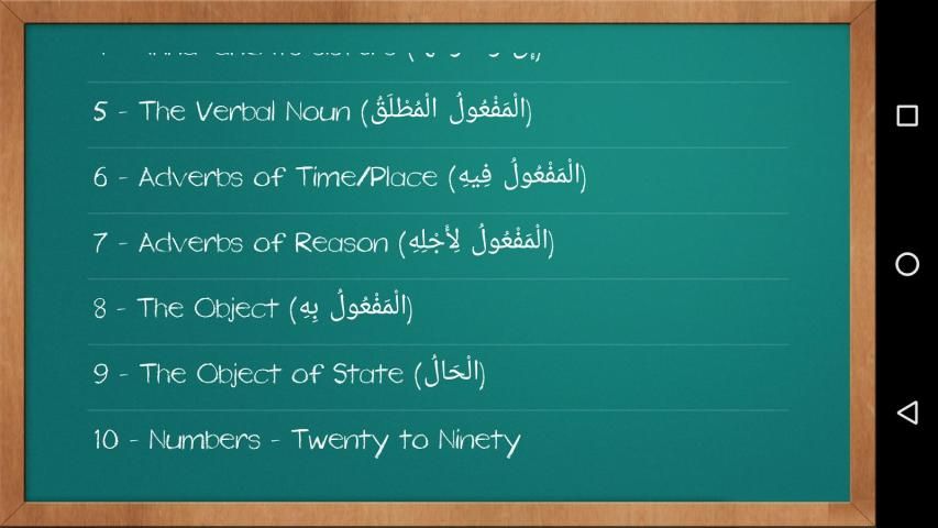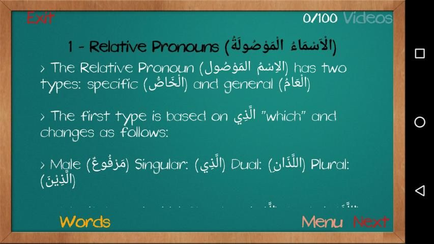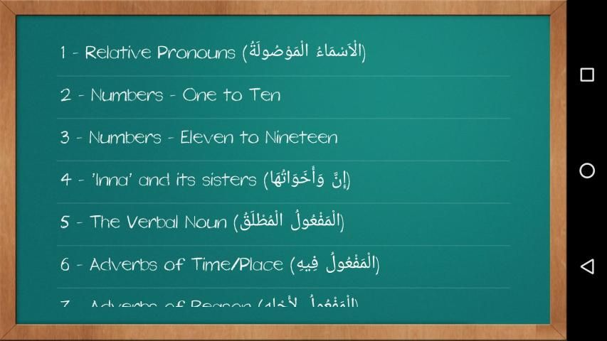 Grammar Bahasa Arab Untuk Semua adalah aplikasi kedua dalam serangkaian program yang telah dirancang khusus untuk memperkenalkan dan menjelaskan dasar-dasar tata bahasa Arab untuk pemula mutlak. Menggunakan sederhana, menyenangkan dan metode inovatif untuk mengajar subjek yang pemula sering dapat menemukan menakutkan dan membingungkan. Ini juga merupakan cara yang ideal bagi mereka yang ingin merevisi dan menguji apa yang telah mereka pelajari.