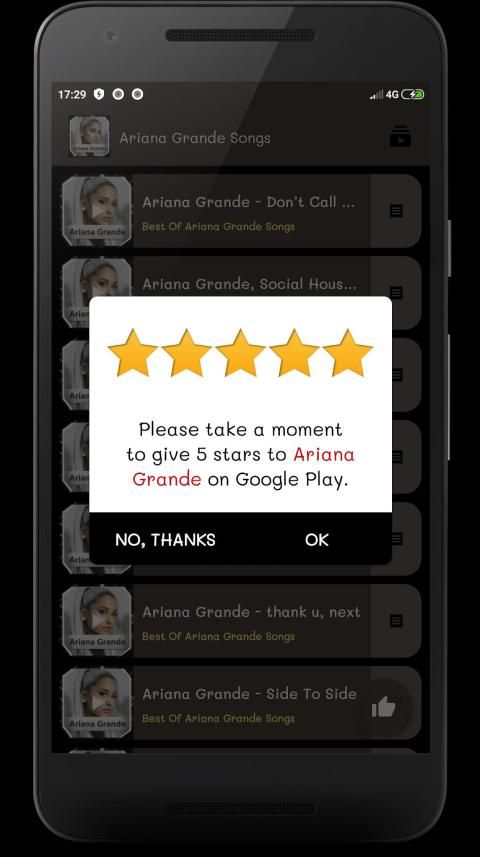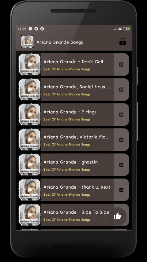 Let us know of what you think about our App in the reviews and what could be improved for your Music Application ( Ariana Grande Songs Plus Lyrics Offline) for android phone and If you like my app, please rate us 5 stars and leave a nice comment, thank you so much Enjoy it ^^